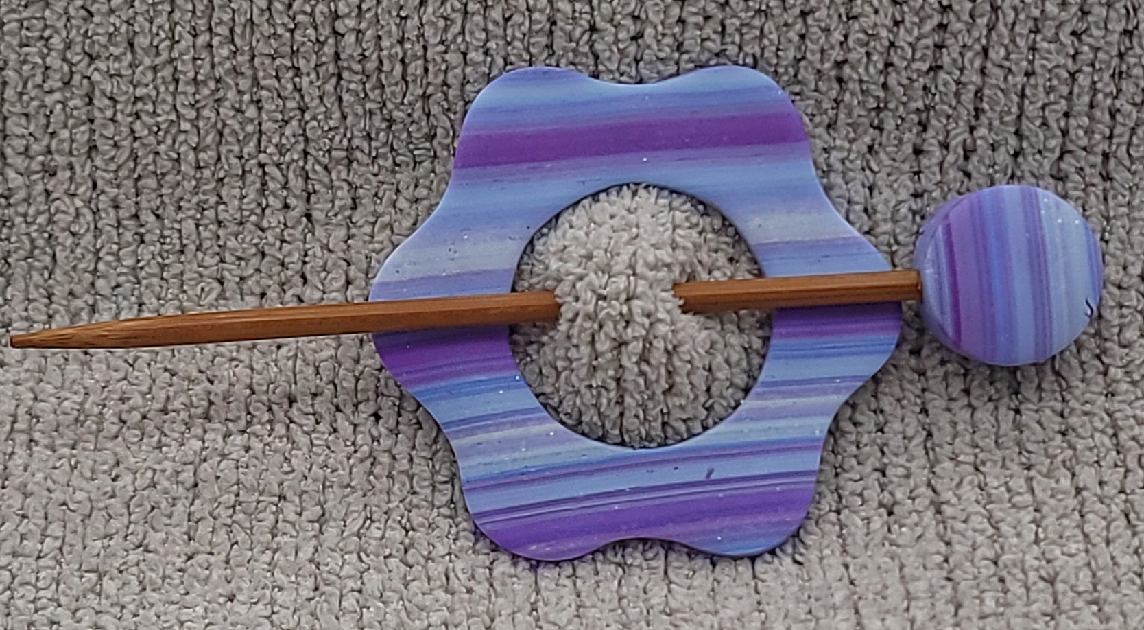All shawl pins and beads on sticks are made with polymer clay. Sticks are bamboo. Sticks measure 3-4 inches long. Pin measures 2.5-3 inches.