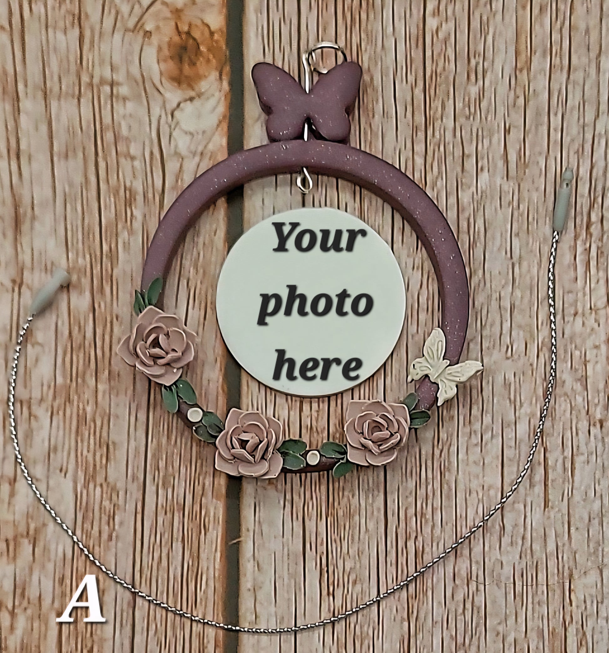 All ornaments are made with polymer clay. Photos are added using a special paper and then sealed with resin to protect photo. You can hang these from your rear view mirror, use an ornament stand, hang in a window or on a tree!